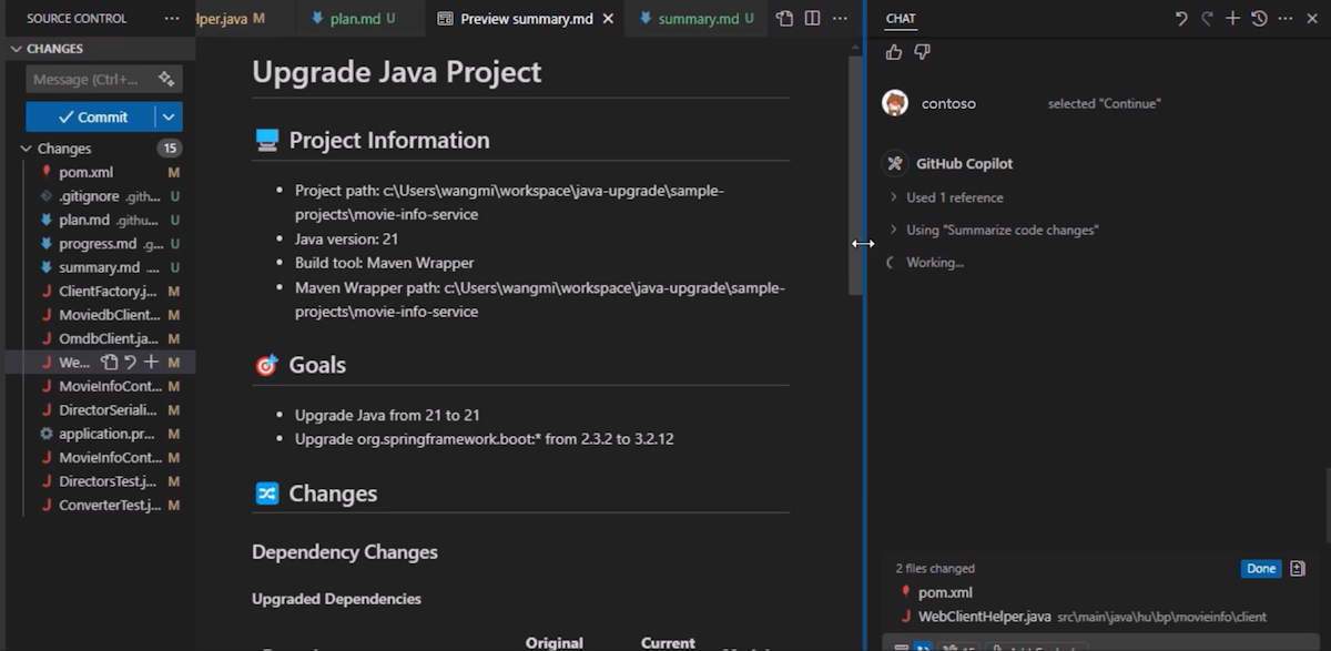 GitHub Copilot then proceeds with the code transformation phase of the project. It uses an open-source tool called OpenRewrite to implement some code changes based on specific recipes. Then, AI addresses the remaining issues through a dynamic build/fix loop. You can monitor progress in the editor area of Visual Studio Code by checking the progress.md markdown file at any time.