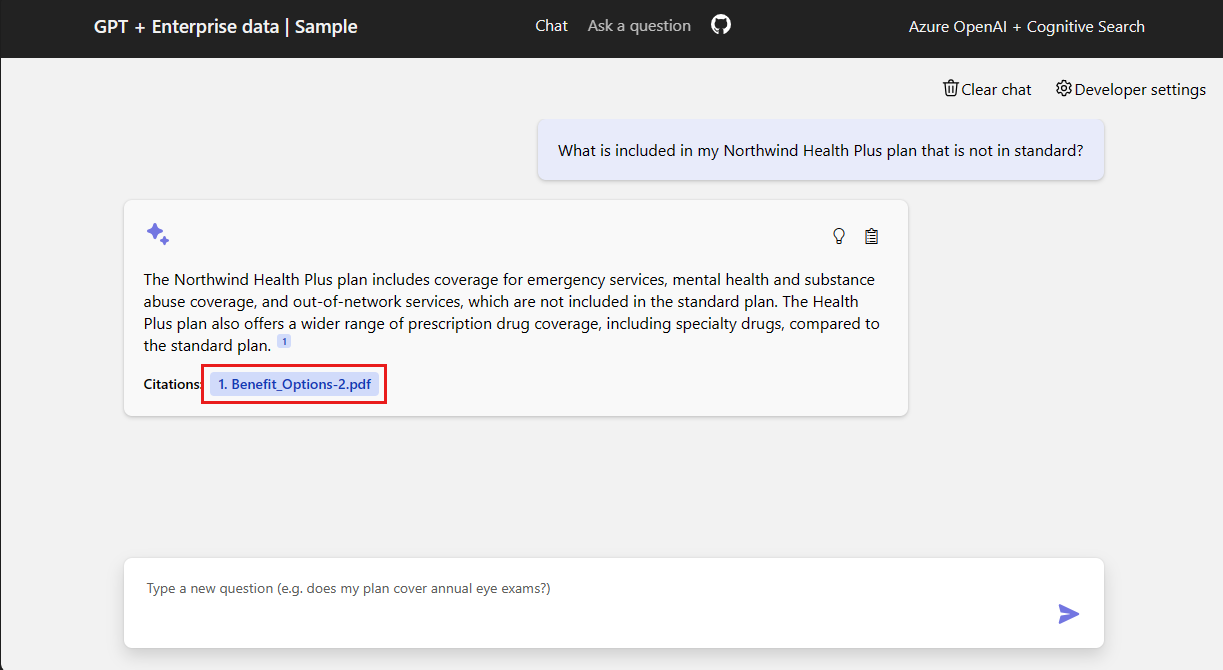 The chat app is preloaded with employee benefits information from PDF files. You can use the chat app to ask questions about the benefits. The following steps walk you through the process of using the chat app.