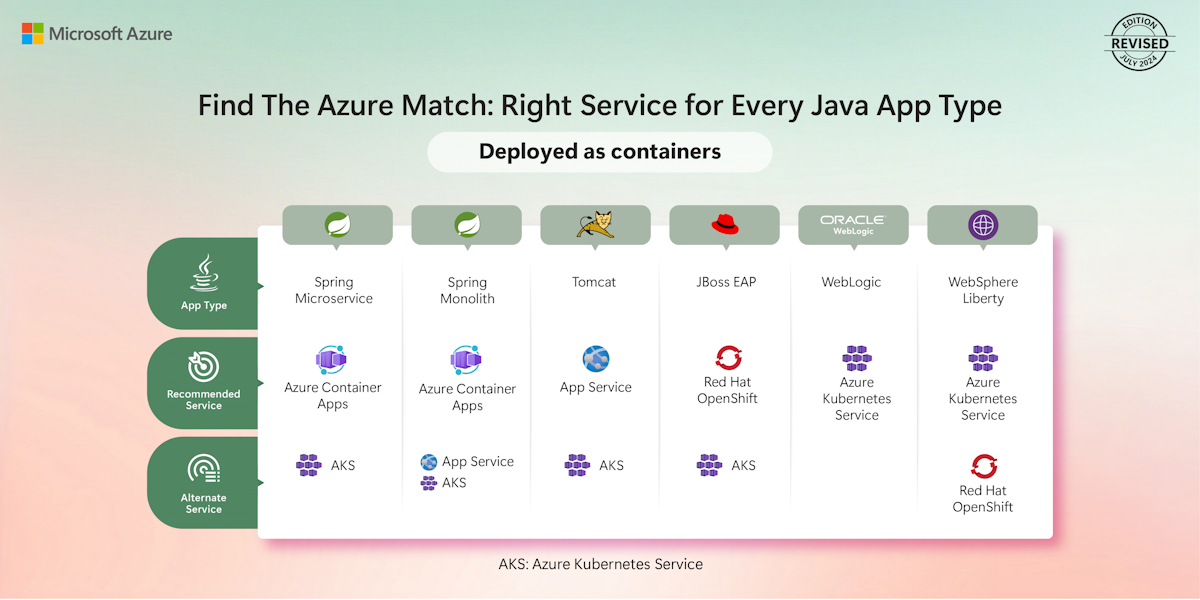 The following diagram shows the recommended Azure services for every Java application type deployed as containers: