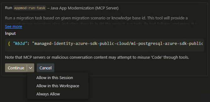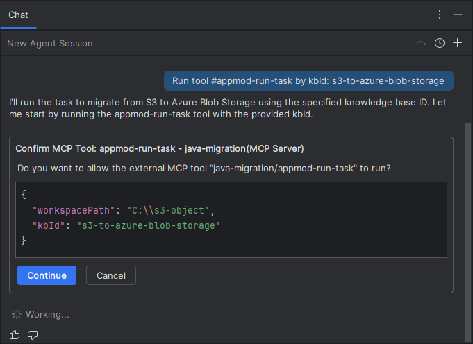 Sometimes, GitHub Copilot app modernization requires explicit confirmation before proceeding. You can type yes or continue in the chat to enable the agent to move forward with the code modifications.