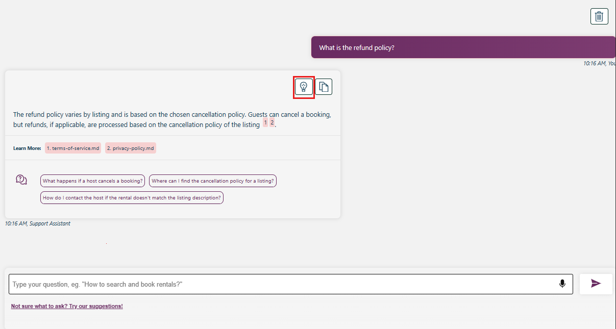 The chat app is preloaded with rental information from a markdown file catalog. You can use the chat app to ask questions about the rental process. The following steps walk you through the process of using the chat app.