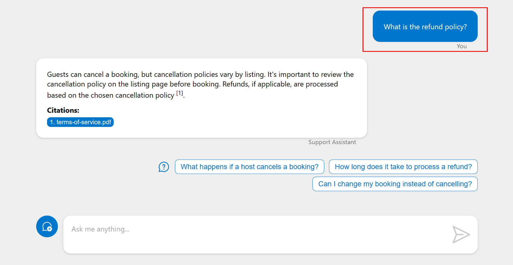 The chat app is preloaded with rental information from a PDF file catalog. You can use the chat app to ask questions about the rental process. The following steps walk you through the process of using the chat app.