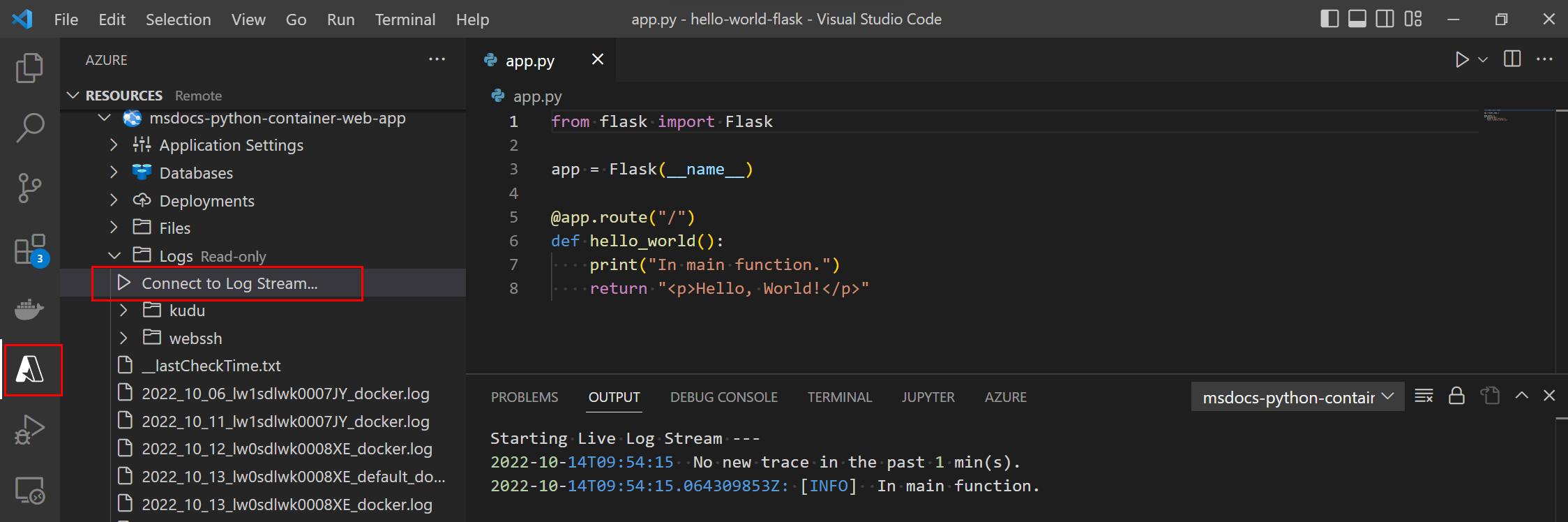There's also support for viewing logs in VS Code. You must have Azure Tools for VS Code installed. Below is an example of viewing Web Apps for Containers (App Service) logs in VS Code.