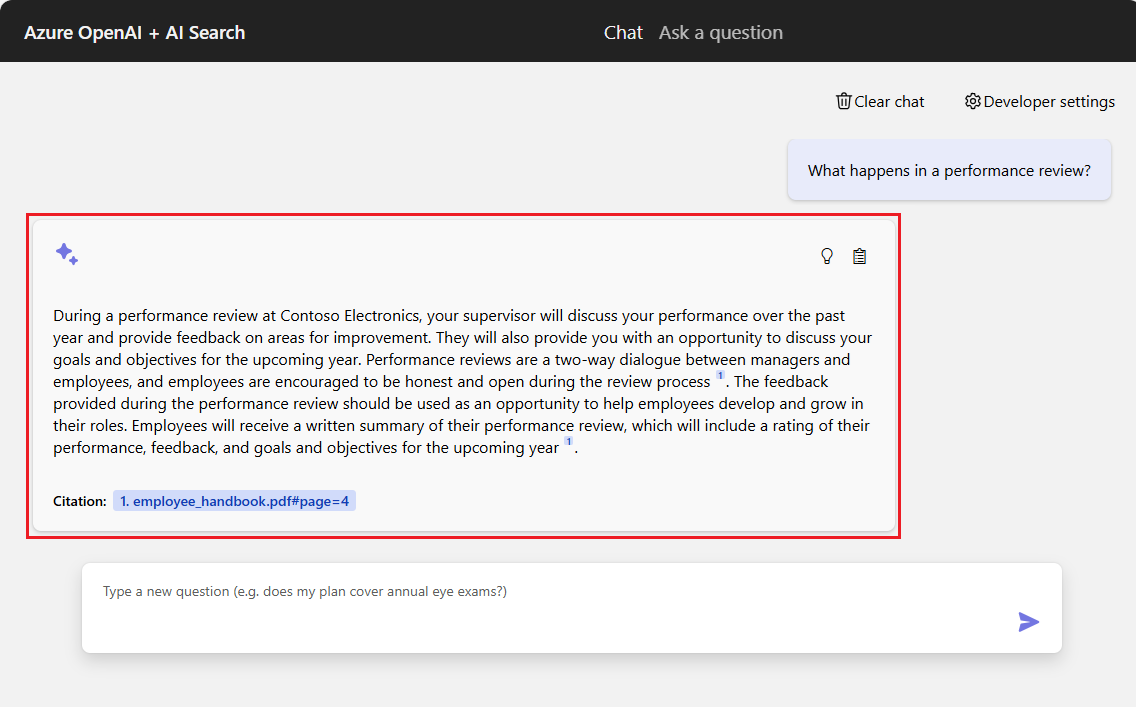 The chat app is preloaded with employee benefits information from PDF files. You can use the chat app to ask questions about the benefits. The following steps walk you through the process of using the chat app. Your answers might vary as the underlying models are updated.