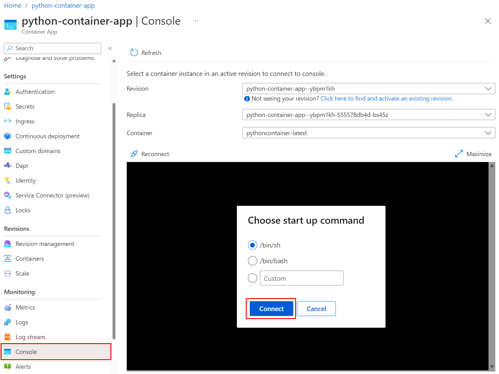 Connect by using the az containerapp exec command: