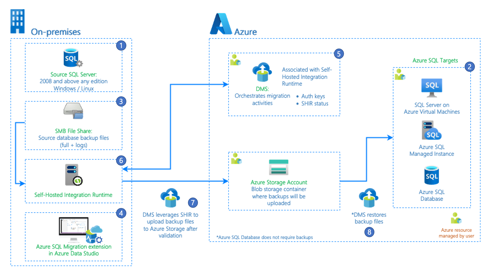 Backup files upload to your Azure storage account: Database Migration Service uses a self-hosted integration runtime to upload valid backup files from the on-premises backup location to your Azure storage account. Data movement activities and pipelines are automatically created in the migration workflow to upload the backup files.