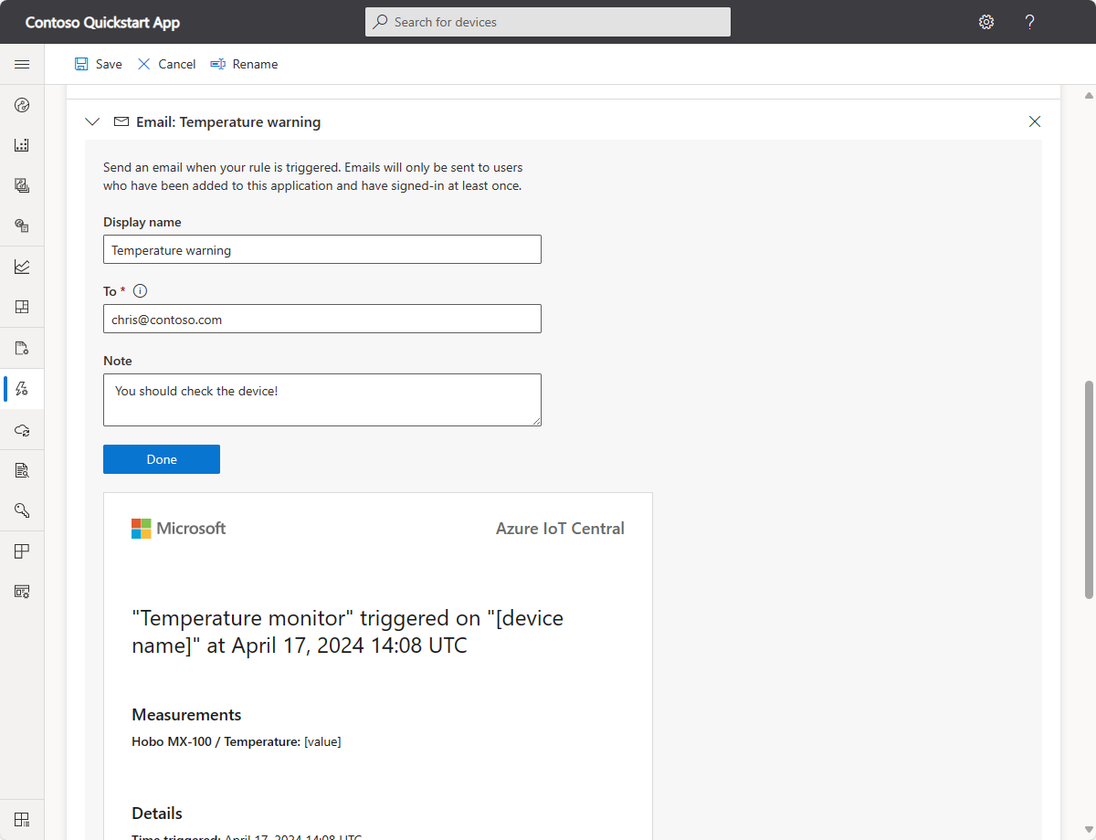 Enter Temperature warning as the display name for the action, your email address in the To field, and You should check the device! as a note to appear in the body of the email.