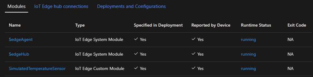 You should see three modules: $edgeAgent, $edgeHub, and SimulatedTemperatureSensor. If one or more of the modules has Yes under Specified in Deployment but not under Reported by Device, your IoT Edge device is still starting them. Wait a few minutes, and then refresh the page.