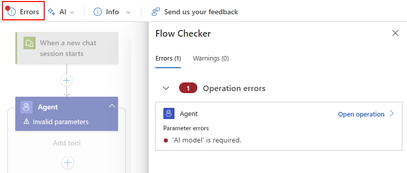 If you try to save the workflow now, the designer toolbar shows a red dot on the Errors button. The designer alerts you to this error condition because the agent requires setup before you can save any changes. However, you don't have to set up the agent now. You can continue to create your workflow. Just remember to set up the agent before you save your workflow.