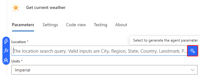 Create agent parameters for 'Get current weather' action