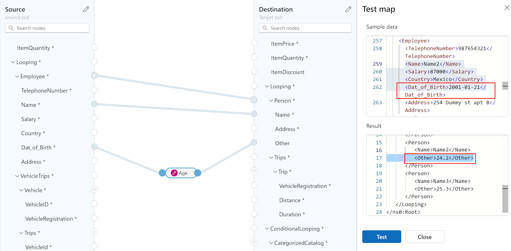 This example uses a test payload and correctly produces results with multiple Address nodes because the source Address node exists in an Employee array, while the destination Address node exists in a Person array.