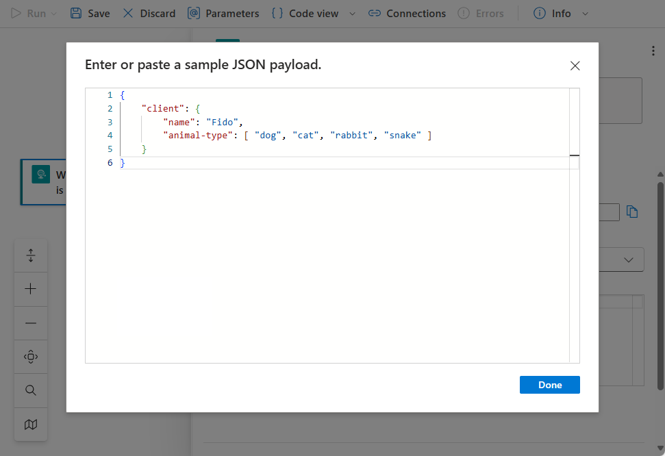 In the Enter or paste a sample JSON payload box, enter a sample payload, then select Done.