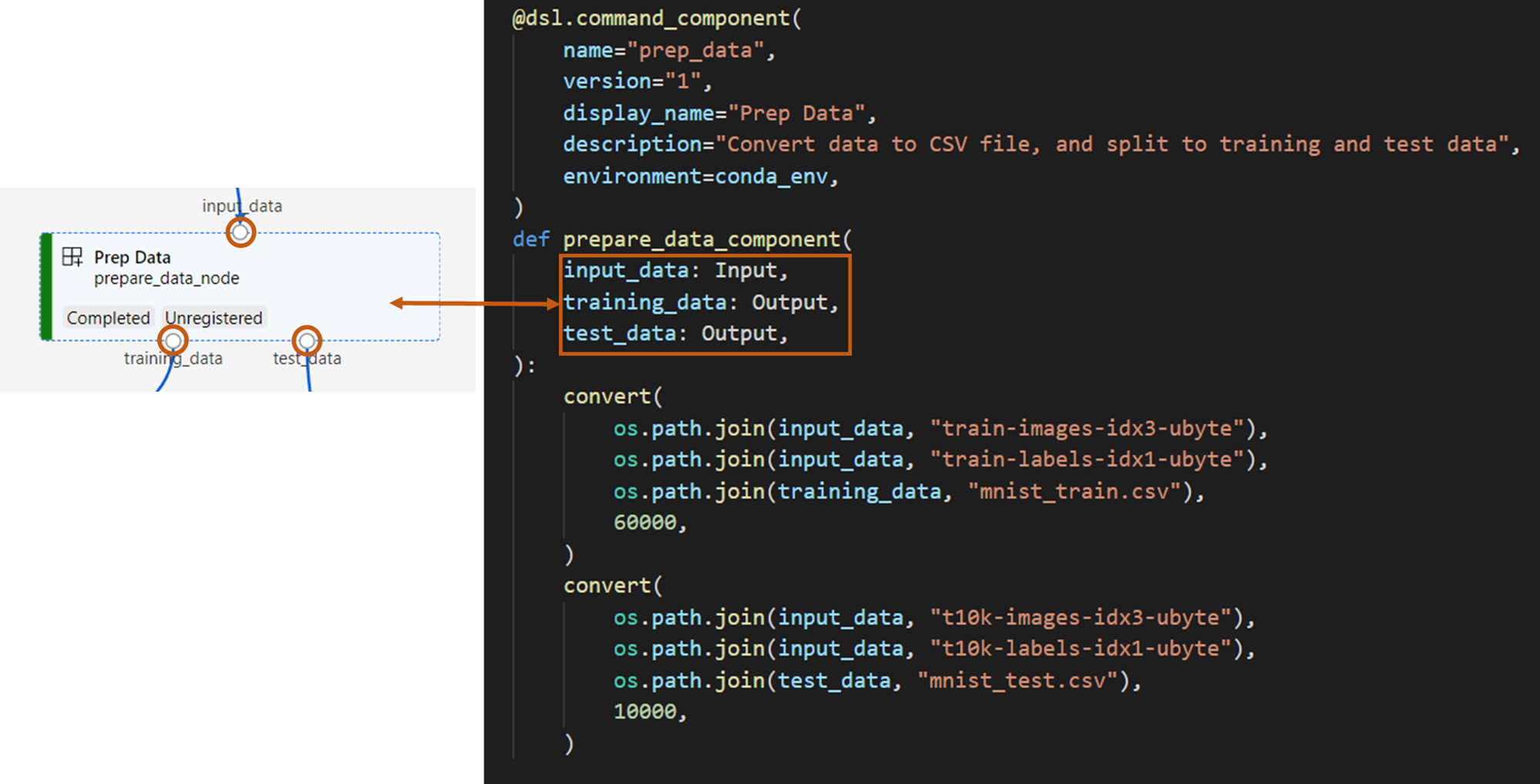 The first component in this pipeline converts the compressed data files of fashion_ds into two .csv files, one for training and the other for scoring. You use a Python function to define this component.