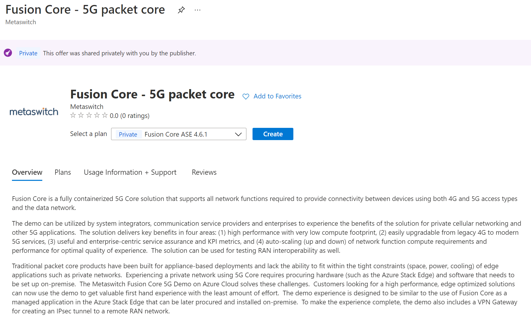 Find the Fusion Core – 5G packet core offer in Marketplace and click Create to begin creating your network function.
