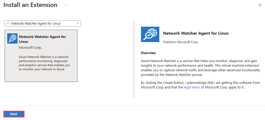 3. In the search box of Install an Extension, enter Network Watcher Agent for Linux. Select the extension from the list and select Next.