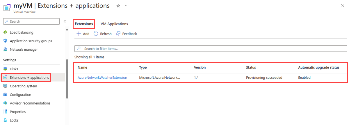 2. Select + Add and search for Network Watcher Agent and install it. If the extension is already installed, you can see it in the list of extensions.