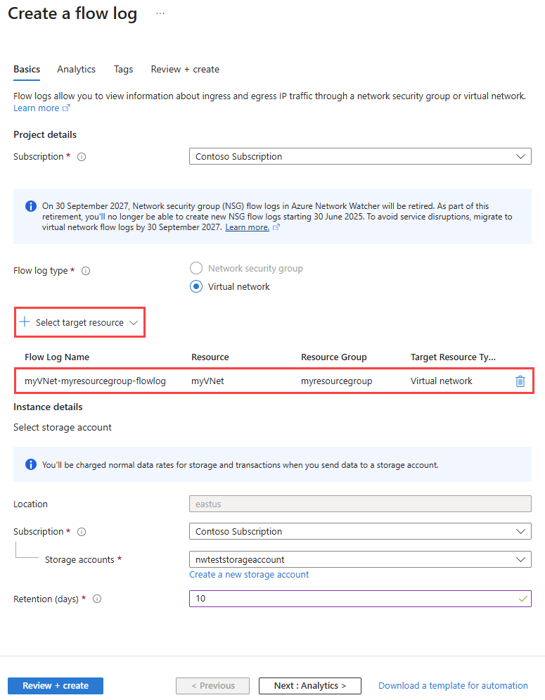 In Select virtual network, select myVNet. Then, select Confirm selection.Flow Log Name Leave the default of myVNet-myresourcegroup-flowlog. Instance details Subscription Select the Azure subscription of your storage account. Storage accounts Select the storage account you created in the previous steps. Retention (days) Enter 10 to retain the flow logs data in the storage account for 10 days. To keep the flow logs data in the storage account forever (until you delete it), enter 0. For information about storage pricing, see Azure Storage pricing. Note