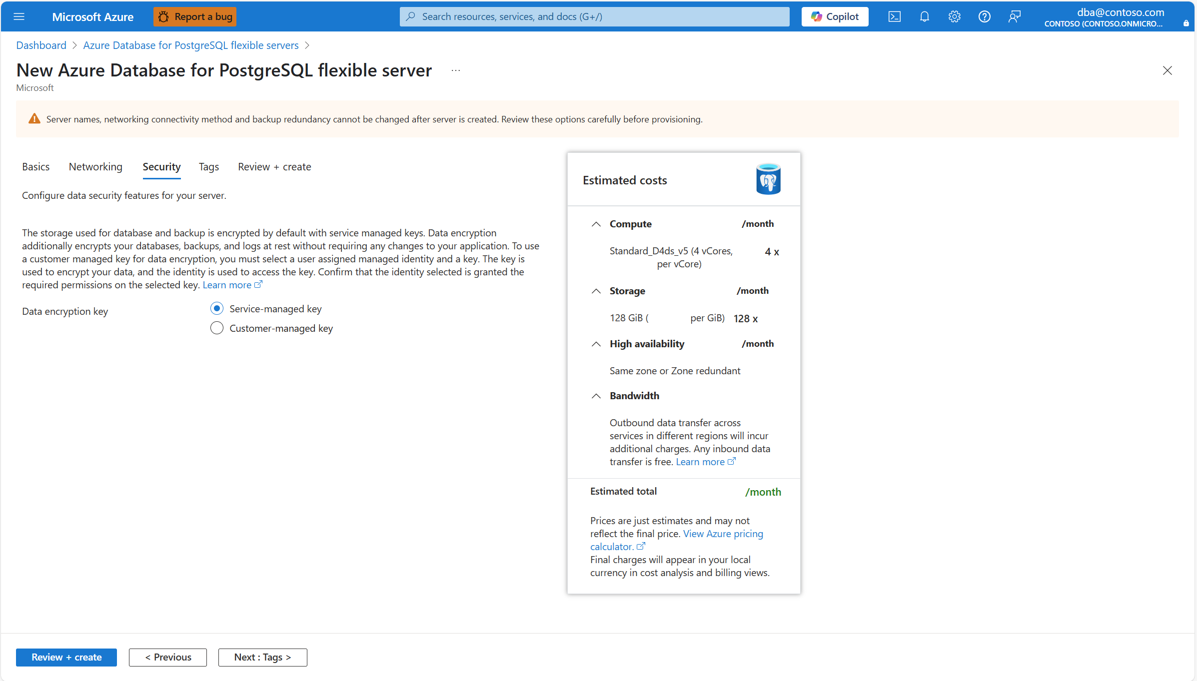 Section Setting Suggested value Description Can be changed after instance creation Data encryption Data encryption key Leave the default setting. Possible values are Service-managed key and Customer-managed key. For more information, see Data encryption at rest in Azure Database for PostgreSQL. Can't be changed after instance is created. After providing all required information in the Security tab, select Next: Tags to move forward to the Tags tab, from where you can attach some tags to your Azure Database for PostgreSQL flexible server instance: