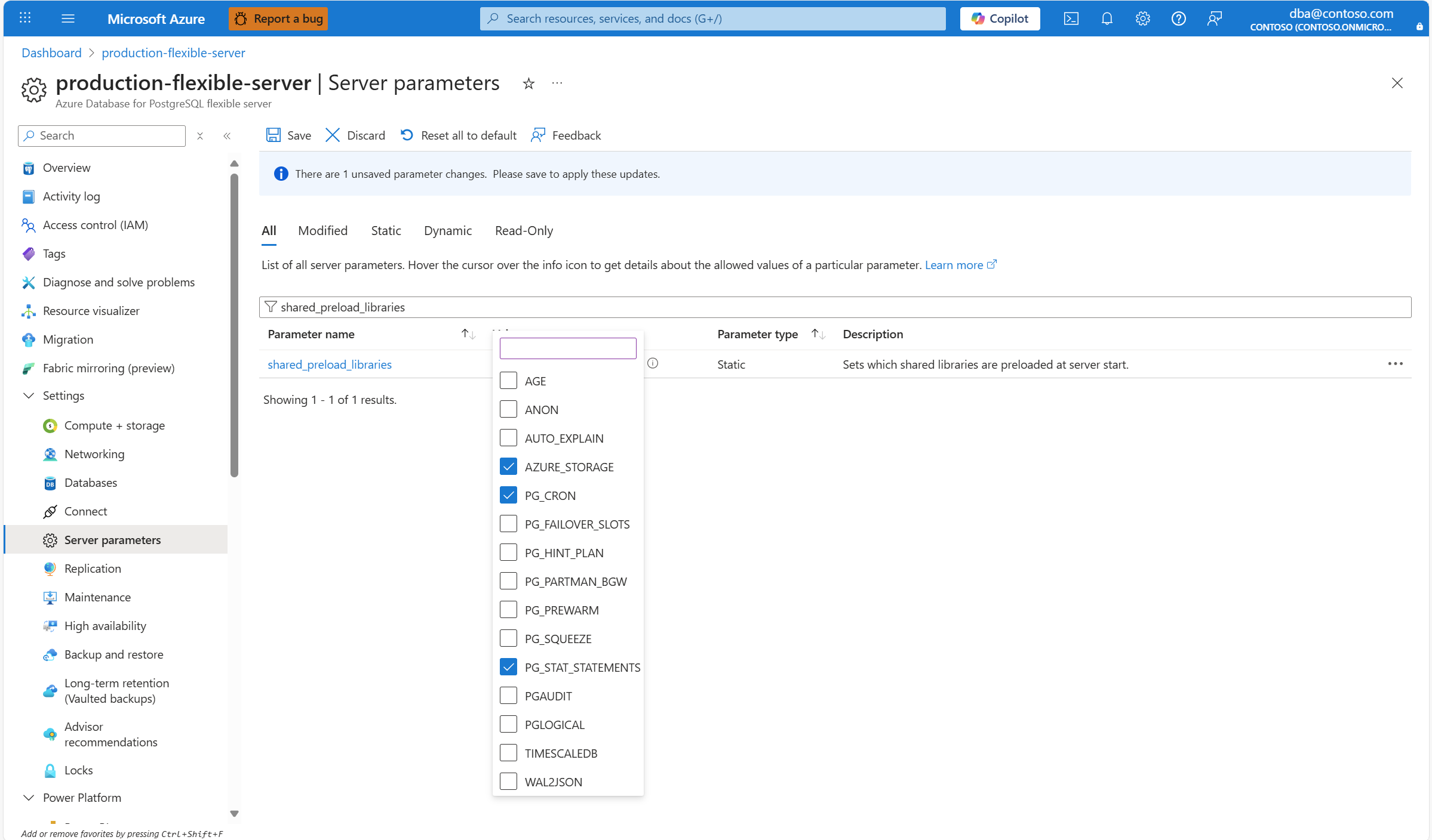 shared_preload_librariesis a static server parameter, it requires a server restart so that the changes take effect.