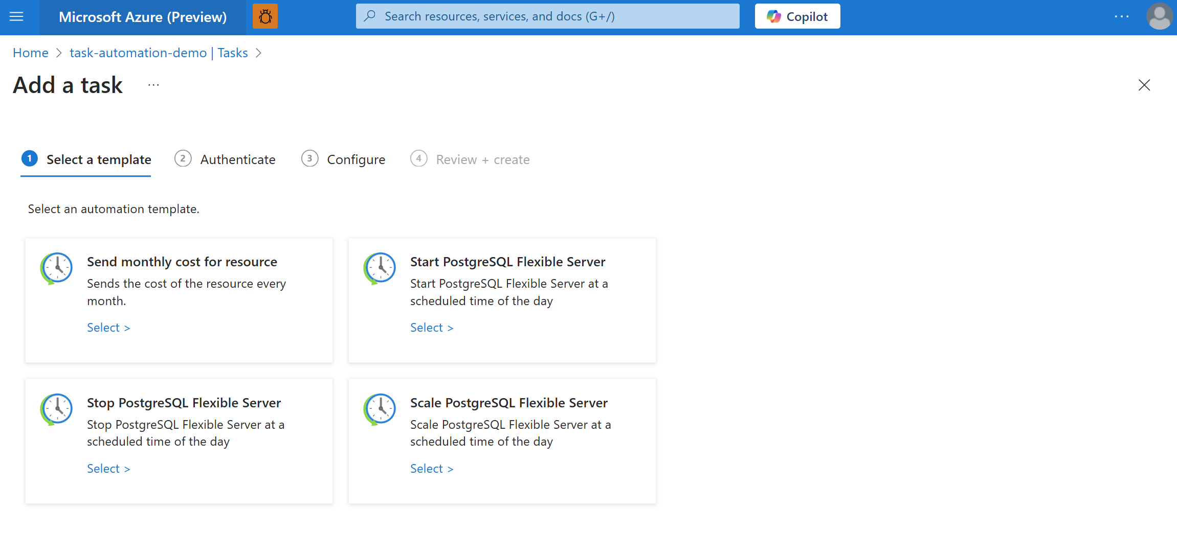 You can also set up automation tasks for other routine tasks such as 'Send monthly cost for resource' and 'Scale Azure Database for PostgreSQL'.