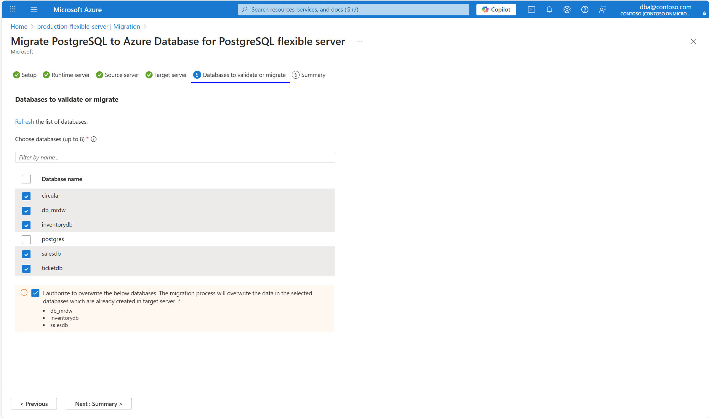 Under the Databases to validate or migrate tab, you can choose a list of user databases to migrate from your source PostgreSQL server.