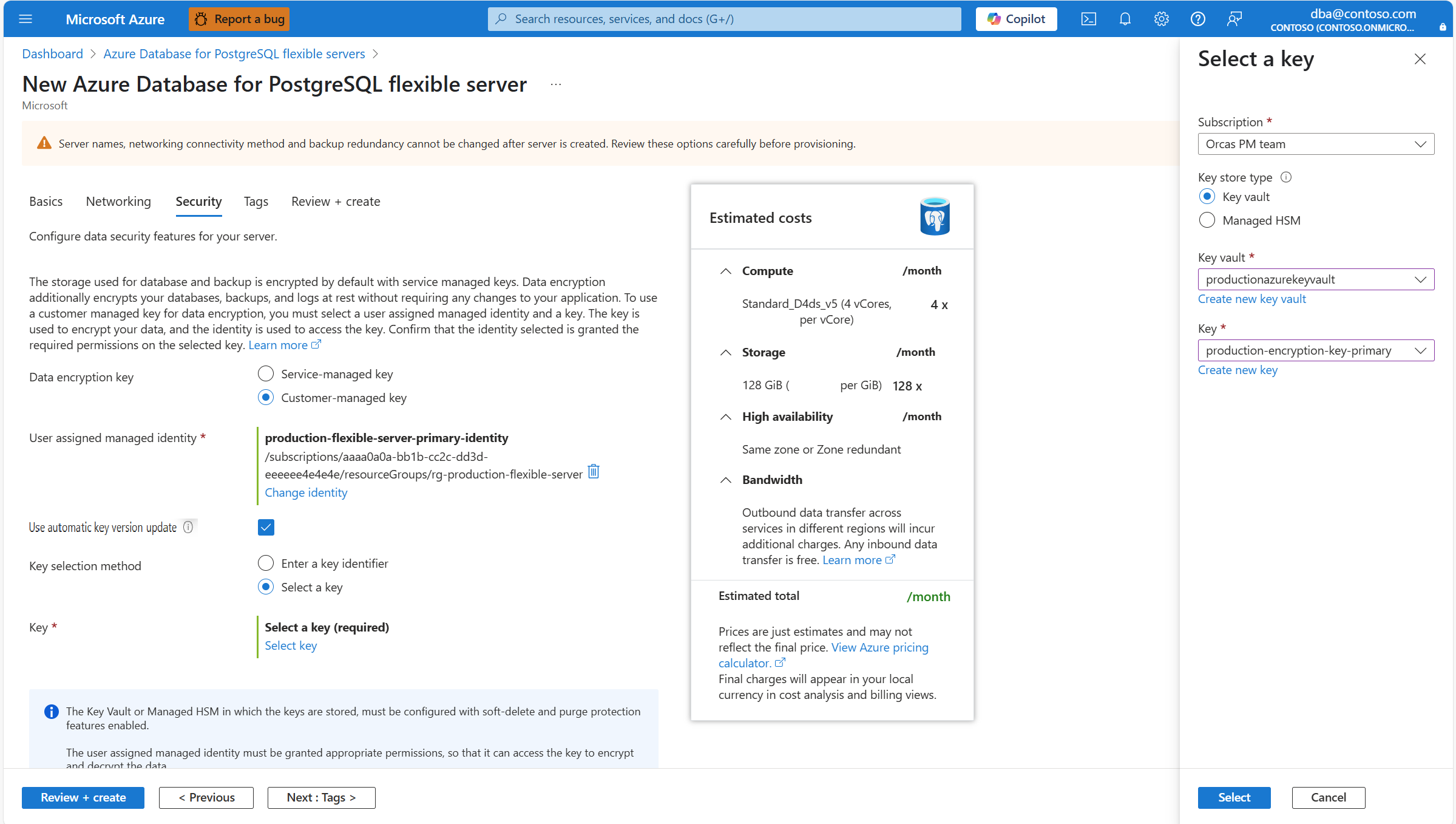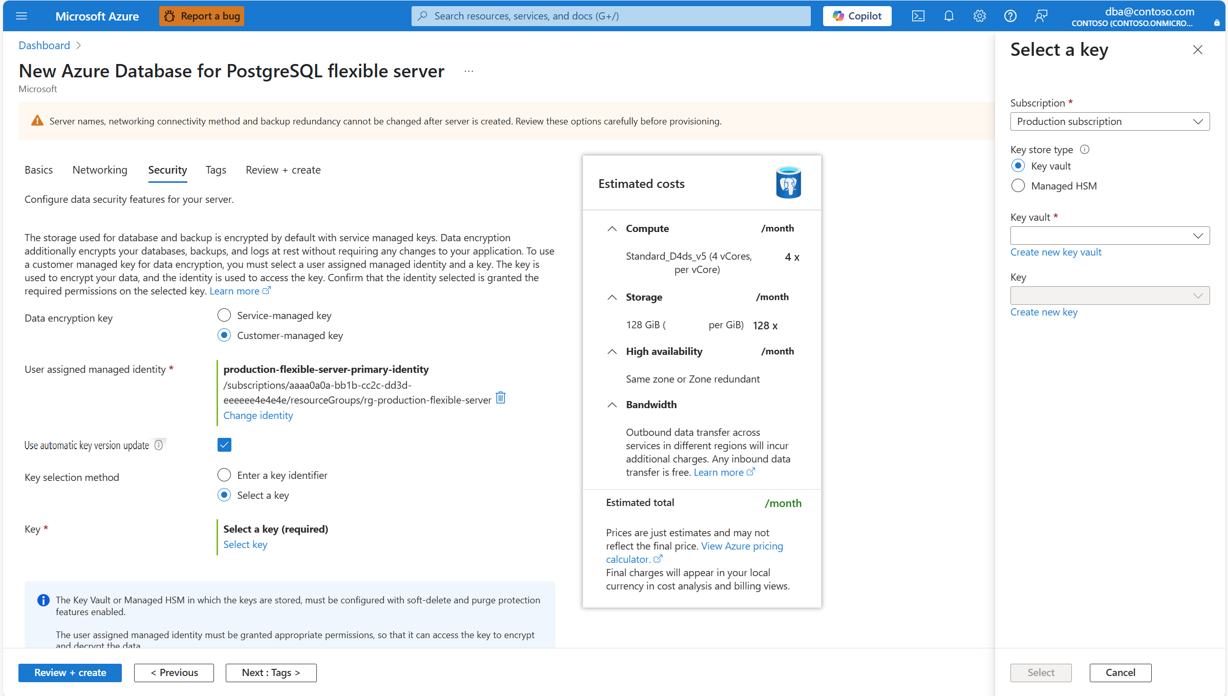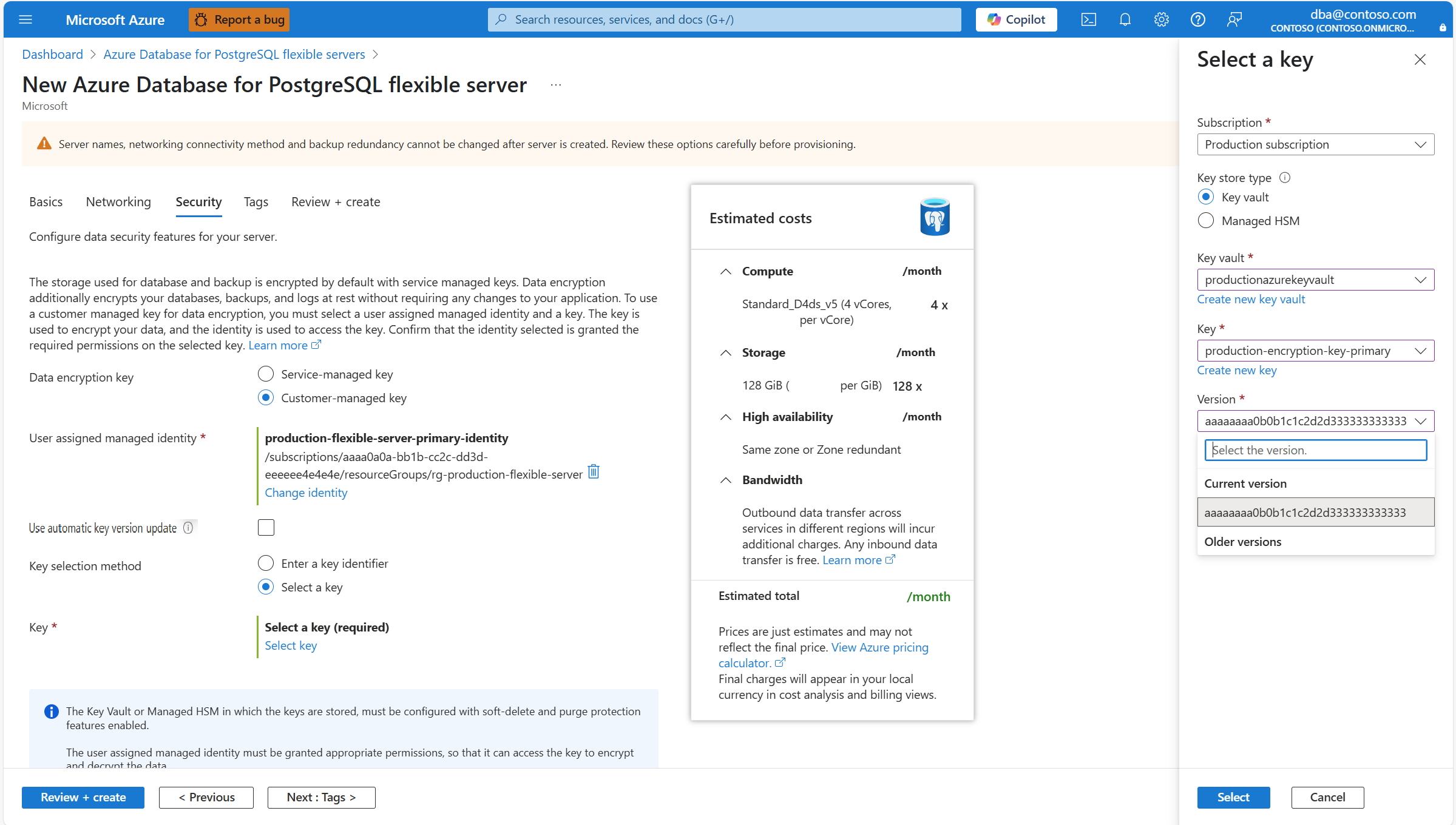 Among the list of user assigned managed identities, select the one you want your server to use to access the data encryption key stored in an Azure Key Vault.