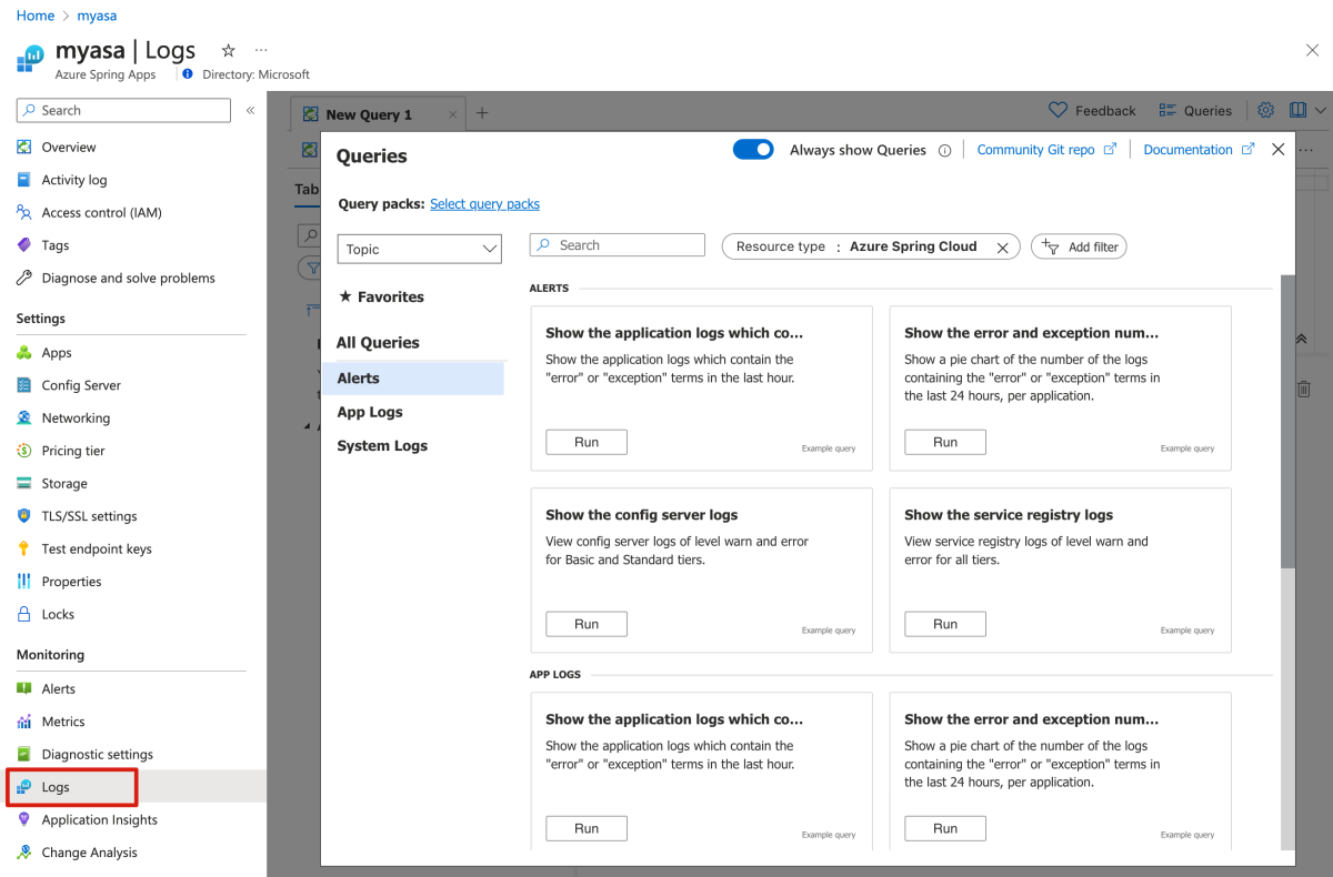 1. Go to the Azure Spring Apps instance Overview page and select Logs to check the app's logs.