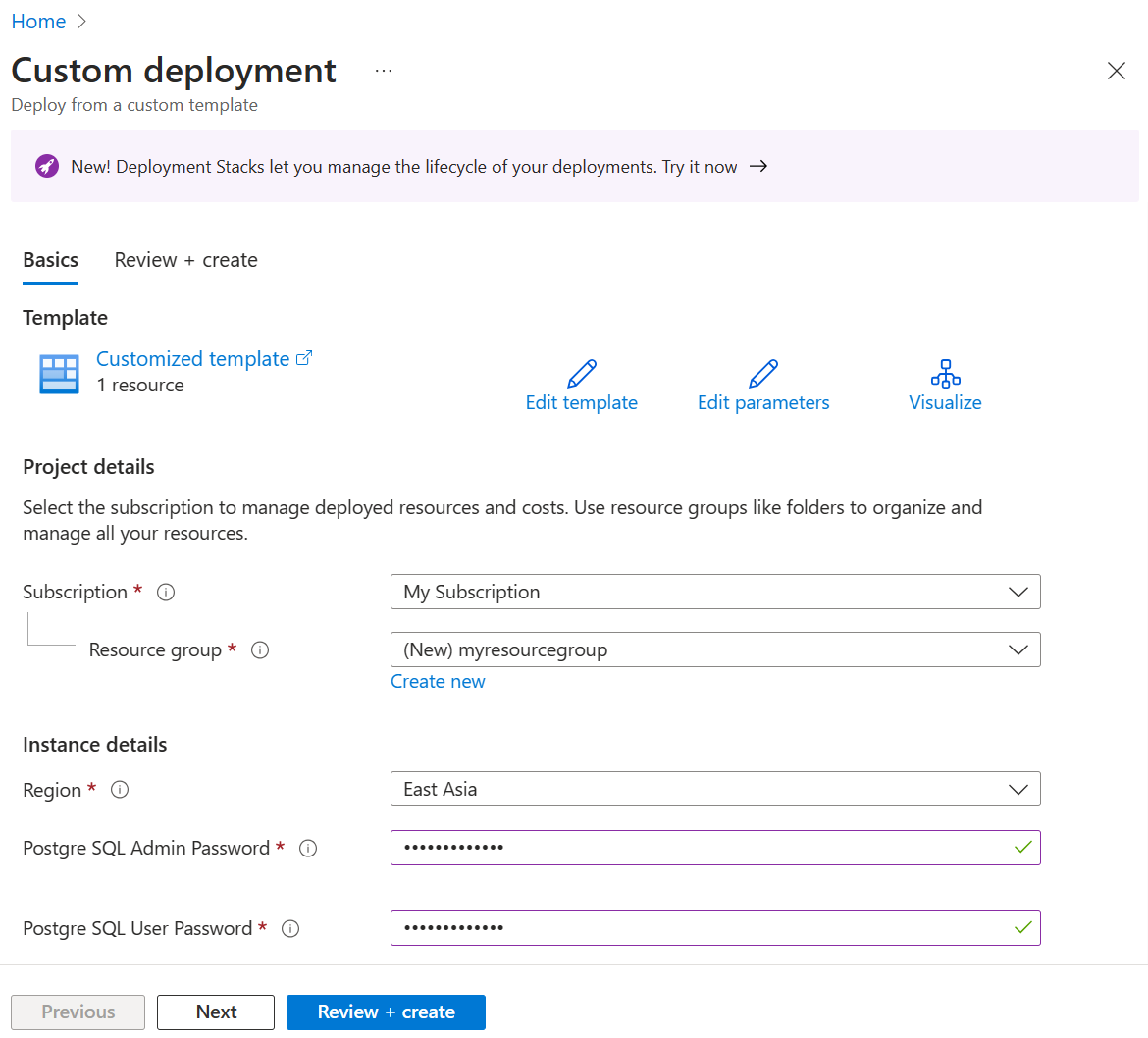 - Enter a new environment name: Provide an environment name, which is used as a suffix for the resource group created to hold all the Azure resources. This name should be unique within your Azure subscription.