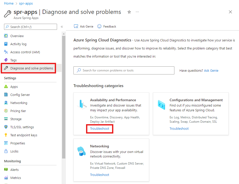 Under Availability and Performance, select Troubleshoot.