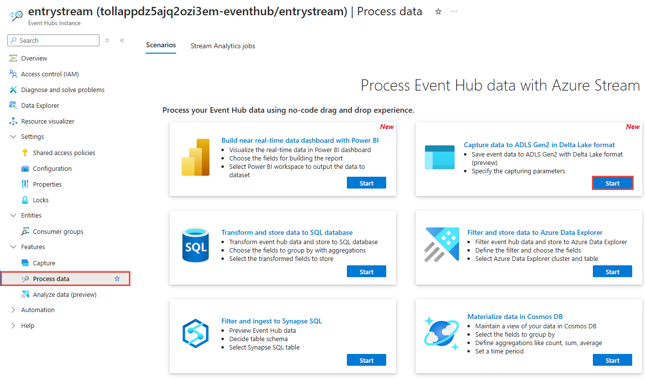 entrystreaminstance.On the Event Hubs instance page, select Process data in the Features section on the left menu.