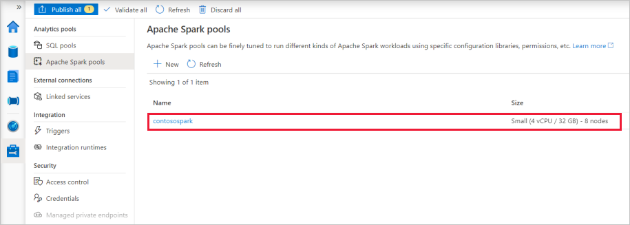Once the provisioning is complete, the new Apache Spark pool will appear in the list.