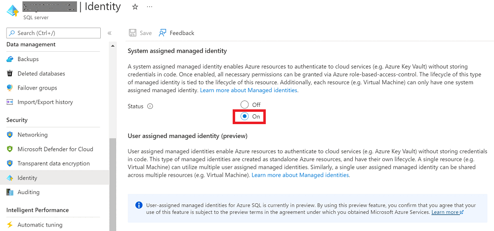 2. Go to your Azure SQL logical server, select Identity, and then set System assigned managed identity to On.