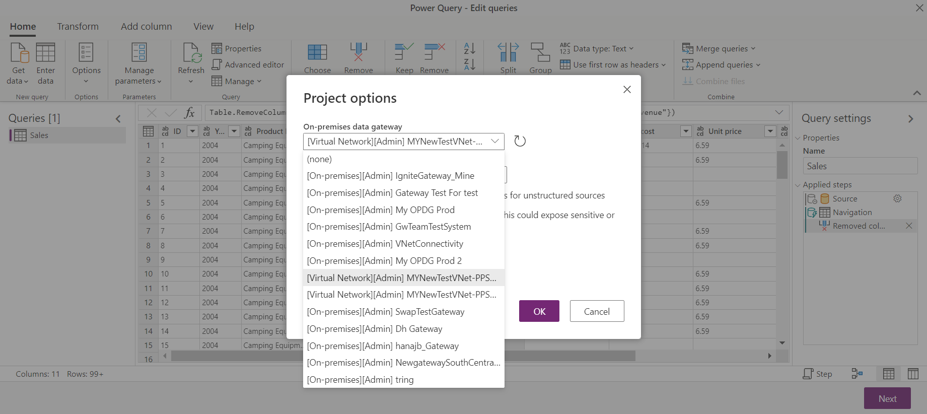 คุณยังสามารถอัปเดตรายละเอียดเกตเวย์ข้อมูล VNet ได้เช่นเดียวกับที่คุณทํากับเกตเวย์ข้อมูลภายในองค์กร ในตัวแก้ไข Power Query ให้เลือกตัวเลือก โครงการตัวเลือก>หน้าแรก> ขณะแก้ไขกระแสข้อมูลของคุณ