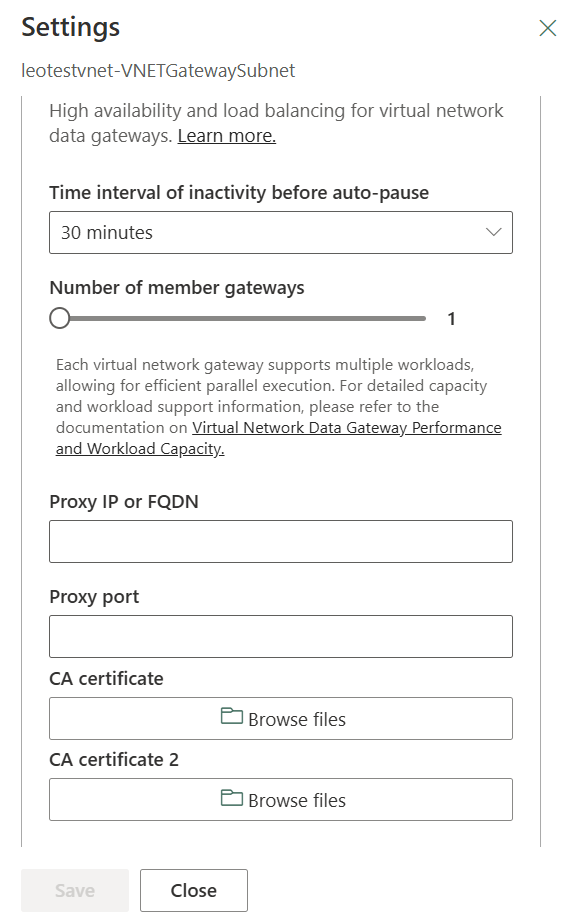 ความจุที่เชื่อมโยงกับเกตเวย์ข้อมูล VNet ของคุณต้องบริโภค คุณสามารถดูและแก้ไขความจุนี้ใน การตั้งค่า สําหรับเกตเวย์ ความจุ Fabric และ Power BI ถูกต้อง เราสนับสนุน F, P SKU และ A SKU เหนือ A4