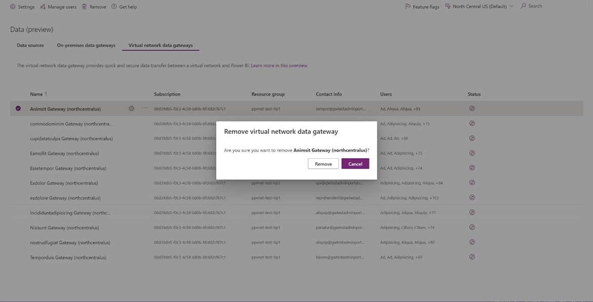 คุณสามารถจัดการผู้ดูแลระบบสําหรับเกตเวย์ข้อมูล VNet นี้ได้เช่นเดียวกับที่คุณดําเนินการสําหรับเกตเวย์ข้อมูลภายในองค์กร ในการตั้งค่า จัดการการเชื่อมต่อและเกตเวย์ ใน Fabric และ Power BI/ ศูนย์การจัดการ Power Platform เมื่อต้องการเพิ่มหรือเอาผู้ดูแลระบบออก ให้เลือกเกตเวย์ แล้วเลือก จัดการผู้ใช้