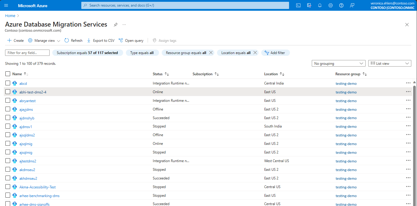 2. In Azure Database Migration Service, select an existing instance of Database Migration Service that's in the selected resource group.
