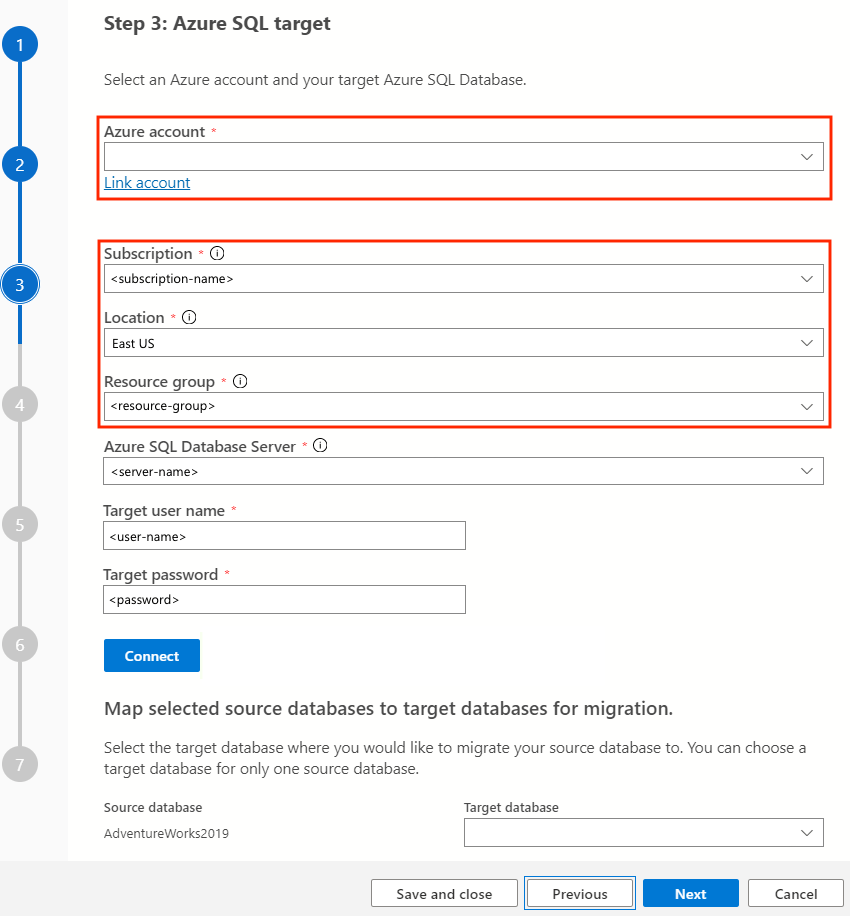 1. In Step 3: Azure SQL target in the Migrate to Azure SQL wizard, complete the following steps for your target Azure SQL Database instance:
