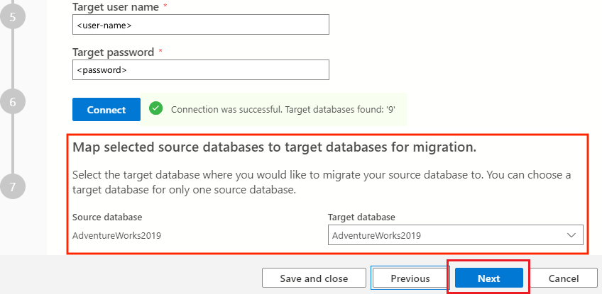 3. Next, map the source database and the target database for the migration. For Target database, select the Azure SQL Database target. Then, select Next to move to the next step in the migration wizard.