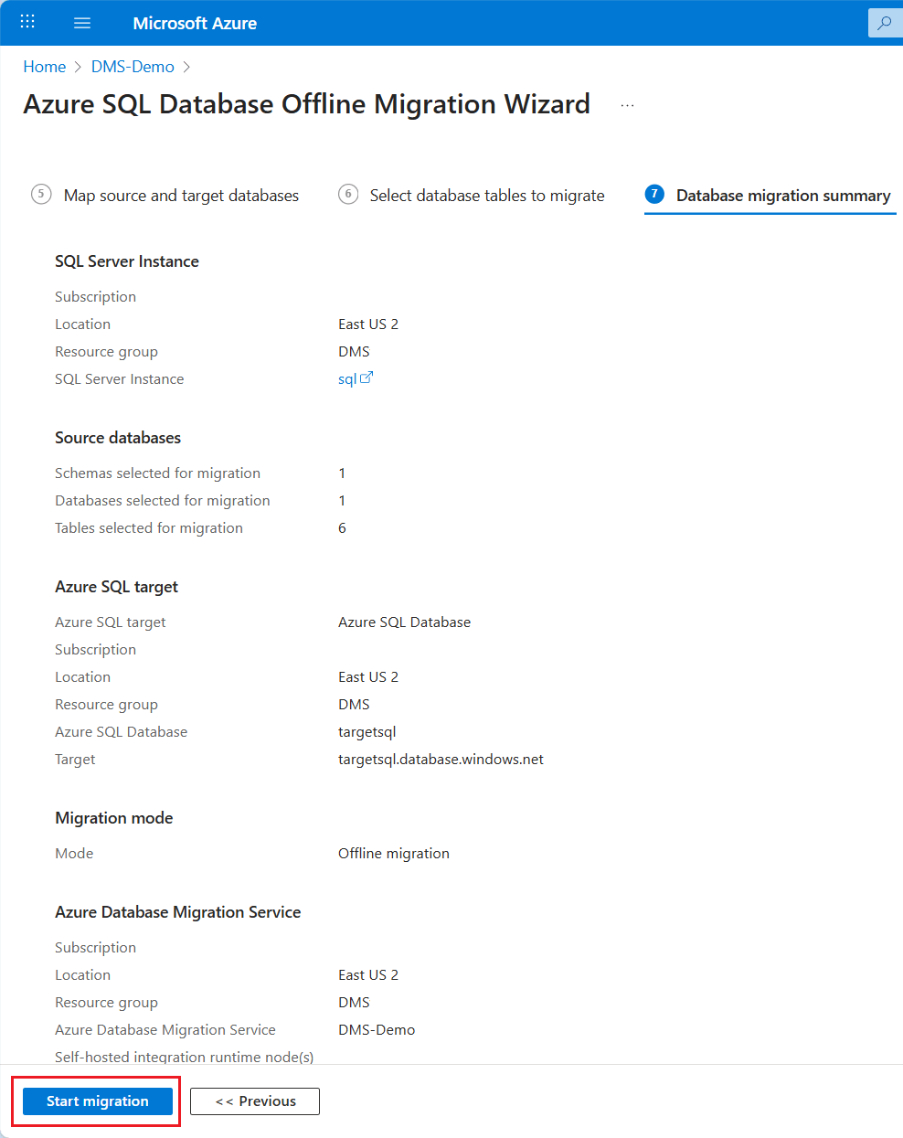 In Step 7: Summary in the Migrate to Azure SQL wizard, review the configuration you created, and then select Start migration to start the database migration.
