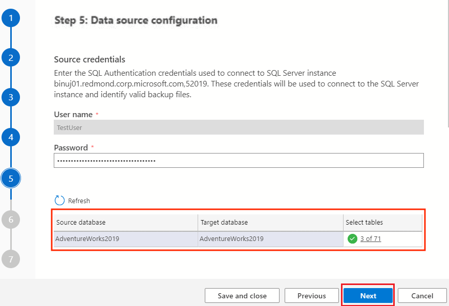 Screenshot that shows source SQL Server credentials.