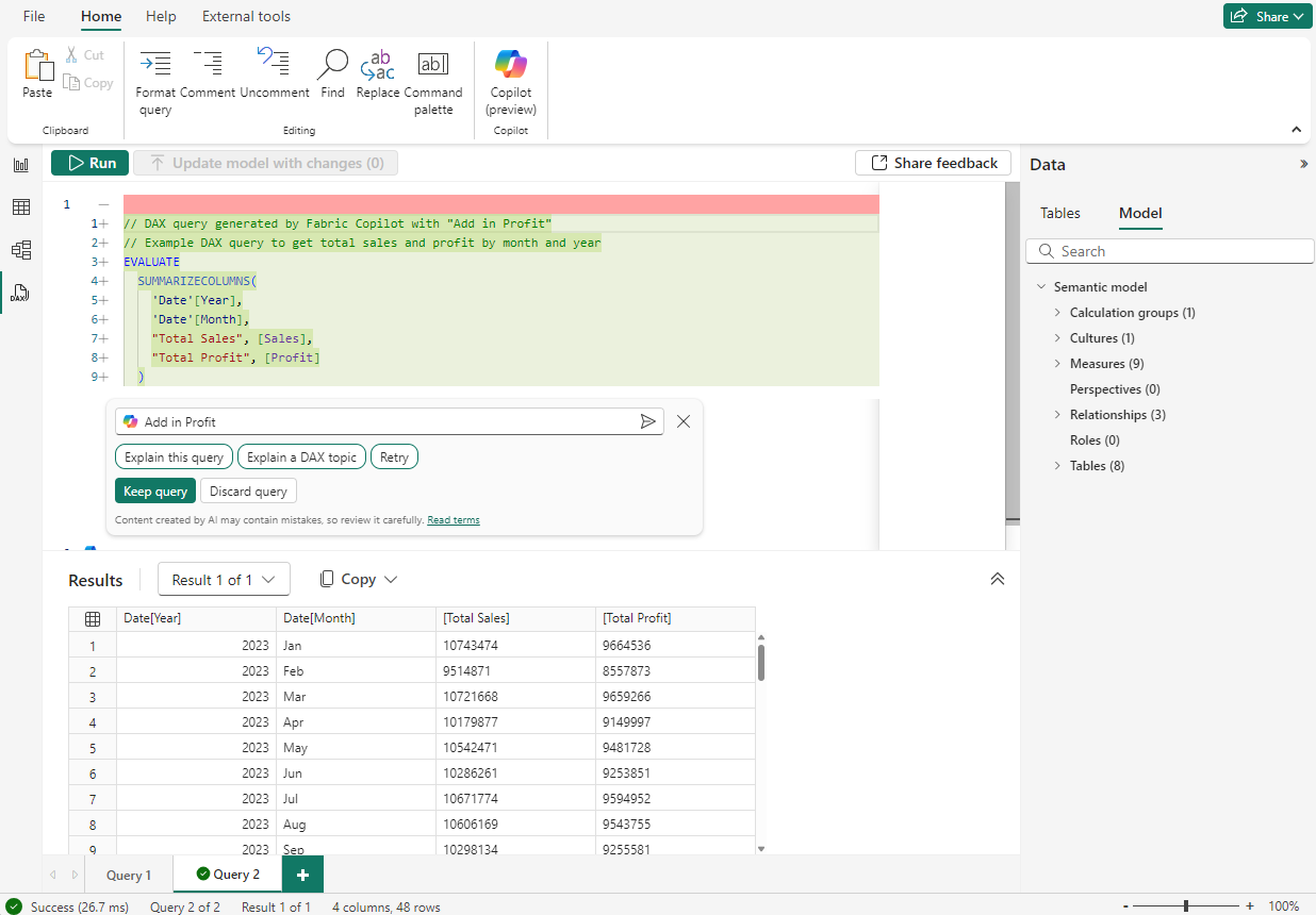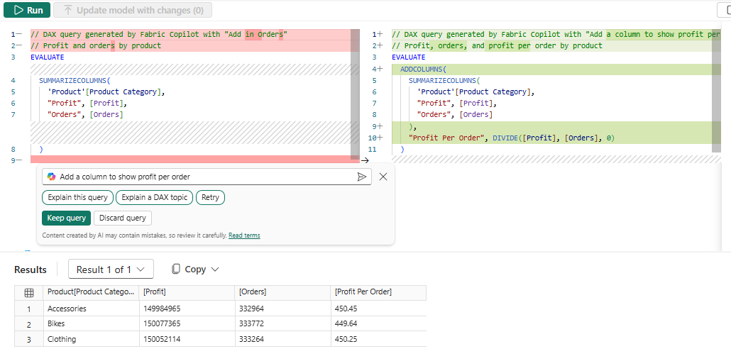 ตอนนี้การจัดรูปแบบที่แตกต่างกันในตัวแก้ไขคิวรี DAX แสดงสิ่งที่ Copilot มีการเปลี่ยนแปลง