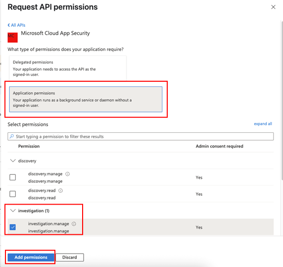 Select Application permissions > Investigation.Read, and then select Add permissions.