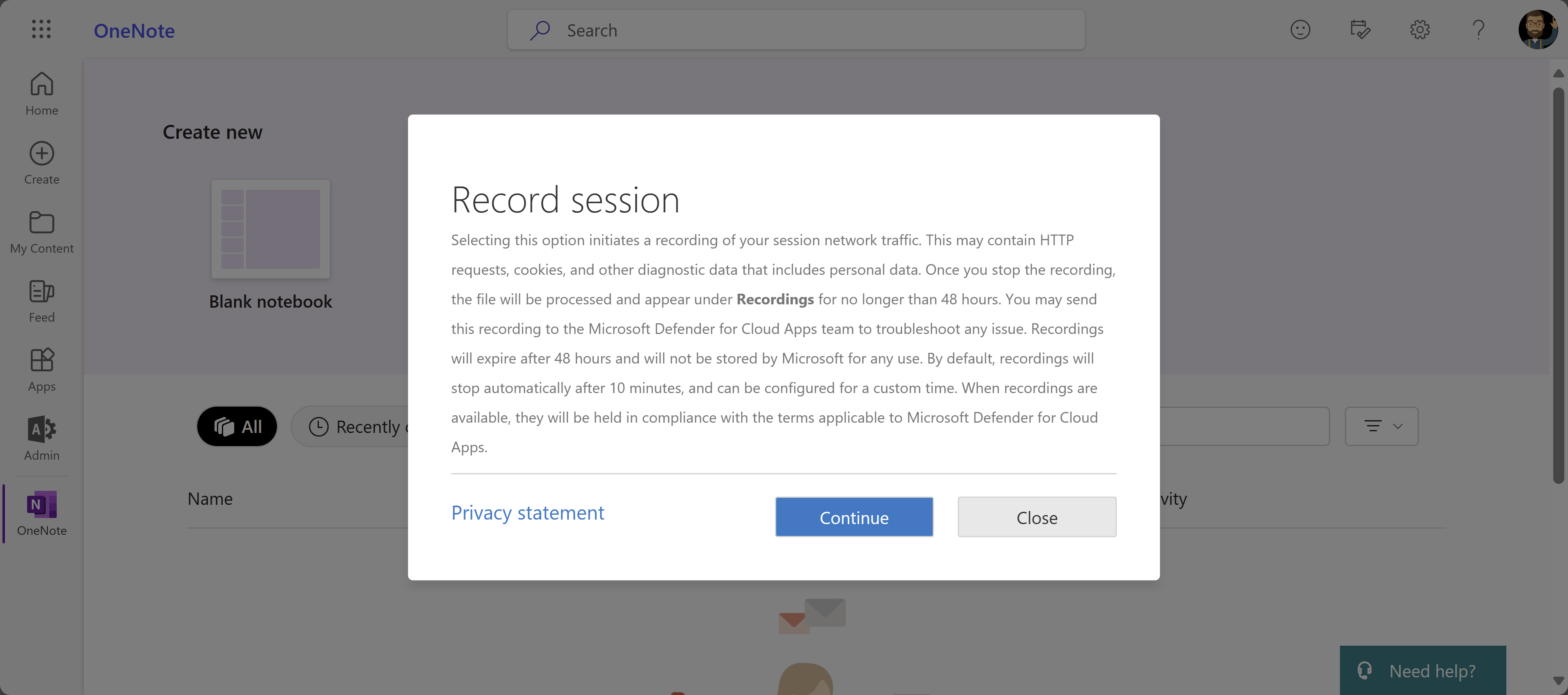 Screenshot of the session recording privacy statement dialog.