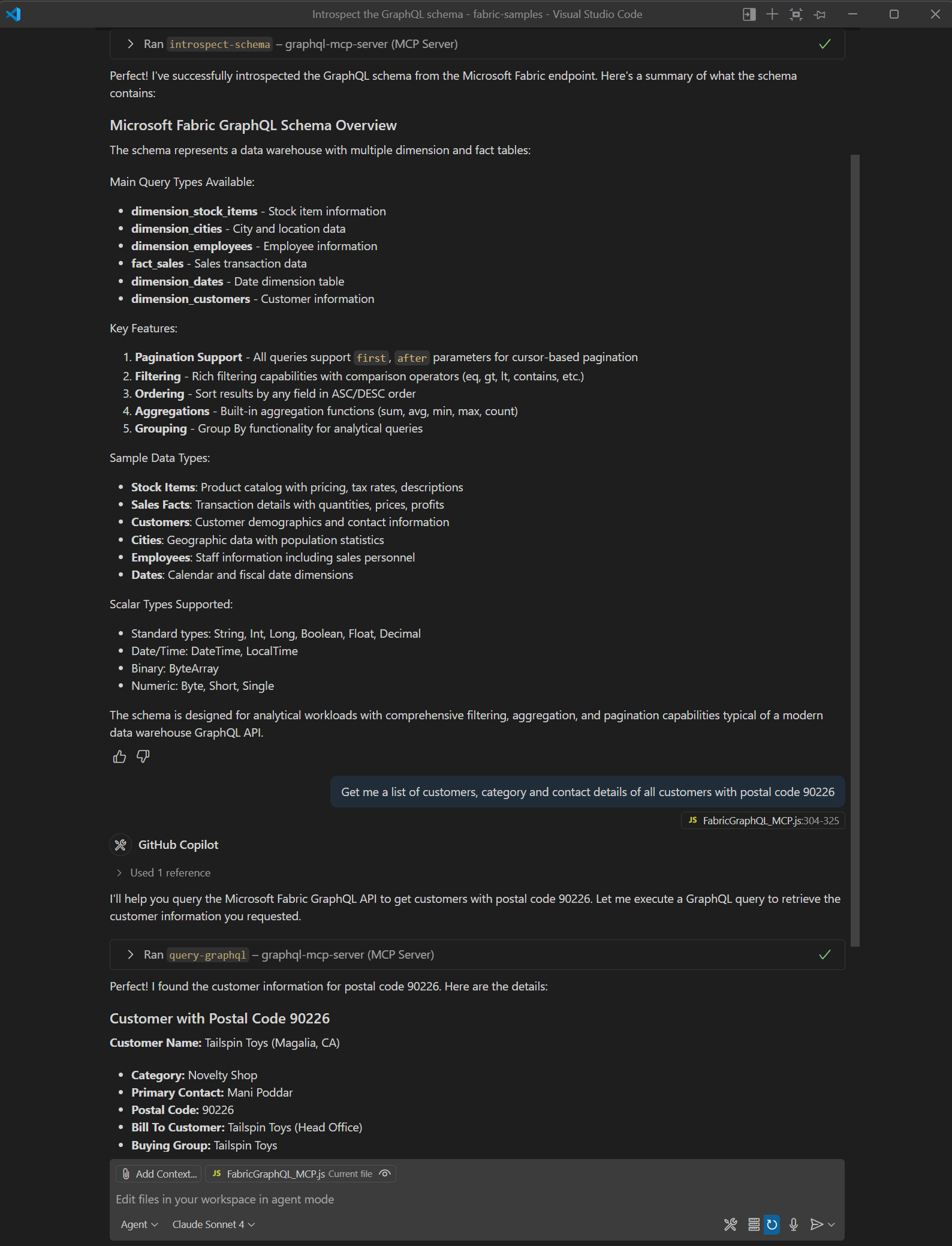{ "fabric-graphql": { "type": "http", "url": "http://localhost:3000/mcp" } } - ในการสนทนา ก่อนอื่นขอให้วินิจสคีมา จากนั้นลองถามคําถามที่เกี่ยวข้องซึ่งเกี่ยวข้องกับข้อมูลเบื้องต้นในภาษาธรรมชาติ