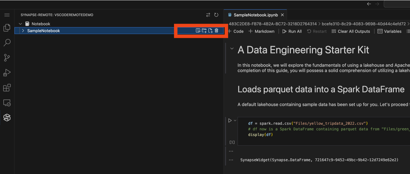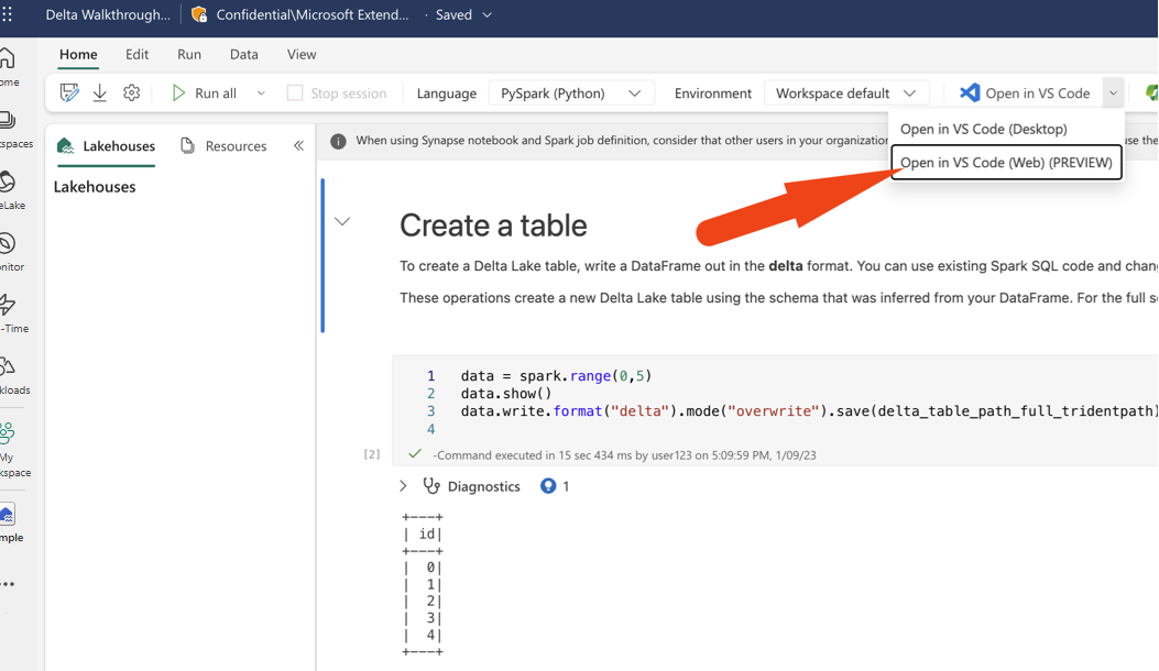 เปิดสมุดบันทึกด้วยส่วนขยาย Fabric Data Engineering VS Code สําหรับเว็บ