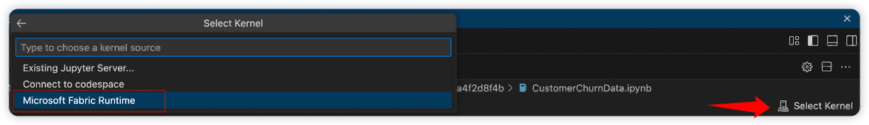 เลือกเคอร์เนล: ในอินเทอร์เฟซสมุดบันทึก ให้เลือกตัวเลือกเคอร์เนล เลือก Microsoft Fabric Runtime เป็นเคอร์เนลของคุณเพื่อเปิดใช้งานคุณลักษณะเฉพาะของ Fabric