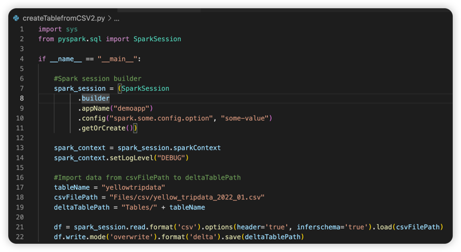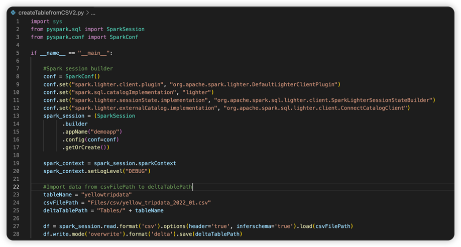 ไฟล์ที่มีชื่อว่า sparkconf.py ประกอบด้วยส่วนย่อยของโค้ดที่คุณจําเป็นต้องเพิ่มเพื่อตั้งค่าวัตถุ SparkConf เมื่อต้องการเปิดใช้งานดีบักระยะไกล ตรวจสอบให้แน่ใจว่ามี การตั้งค่าวัตถุ SparkConf อย่างถูกต้อง รูปภาพต่อไปนี้แสดงเวอร์ชันเดิมของโค้ดต้นฉบับ
