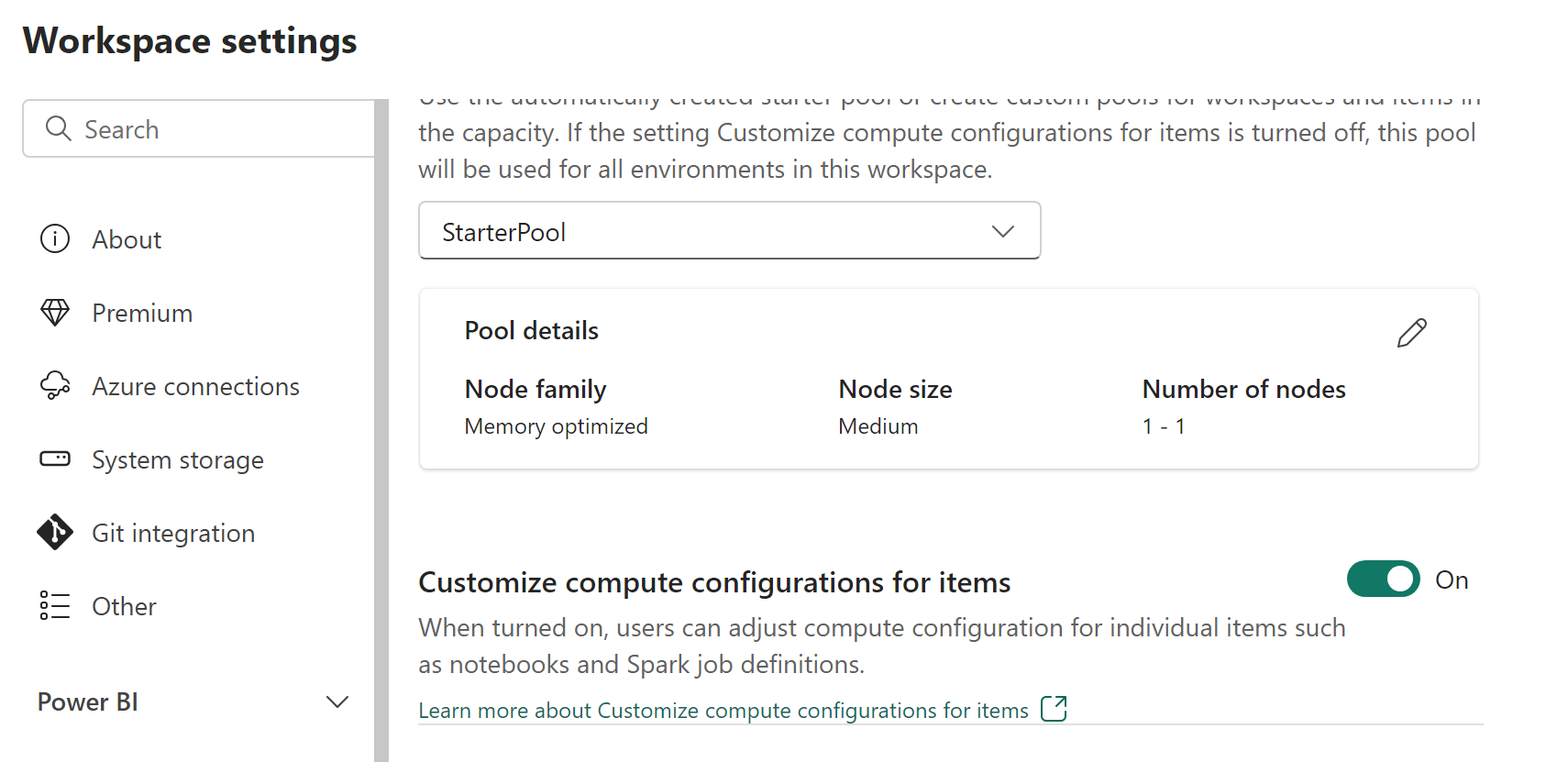 หลังจากที่คุณเลือกกลุ่มในส่วน คํานวณ แล้ว คุณสามารถปรับแต่งแกนและหน่วยความจําสําหรับผู้ปฏิบัติการภายในขอบเขตของขนาดโหนดและขีดจํากัดของพูลที่เลือกได้ สําหรับข้อมูลเพิ่มเติมเกี่ยวกับขนาดการคํานวณและแกนหรือตัวเลือกหน่วยความจําของ Spark ให้ดู Spark compute ใน Fabric ใช้ส่วน คํานวณ เพื่อกําหนดค่าคุณสมบัติระดับเซสชัน Spark เพื่อกําหนดหน่วยความจําและแกนของตัวดําเนินการตามความต้องการของปริมาณงาน คุณสมบัติ Spark ตั้งค่าผ่าน spark.conf.set การควบคุมพารามิเตอร์ระดับแอปพลิเคชันไม่เกี่ยวข้องกับตัวแปรสภาพแวดล้อม
