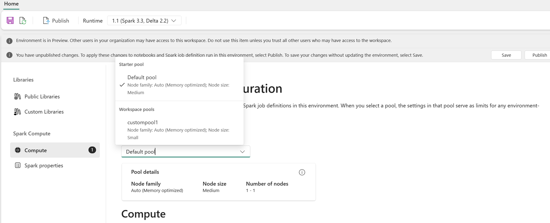 ในฐานะผู้ใช้ คุณสามารถเลือกกลุ่มสําหรับสภาพแวดล้อมจากรายการของพูลที่พร้อมใช้งานในพื้นที่ทํางาน Fabric ผู้ดูแลระบบพื้นที่ทํางาน Fabric สร้างกลุ่มเริ่มต้นและกลุ่มแบบกําหนดเองเริ่มต้น