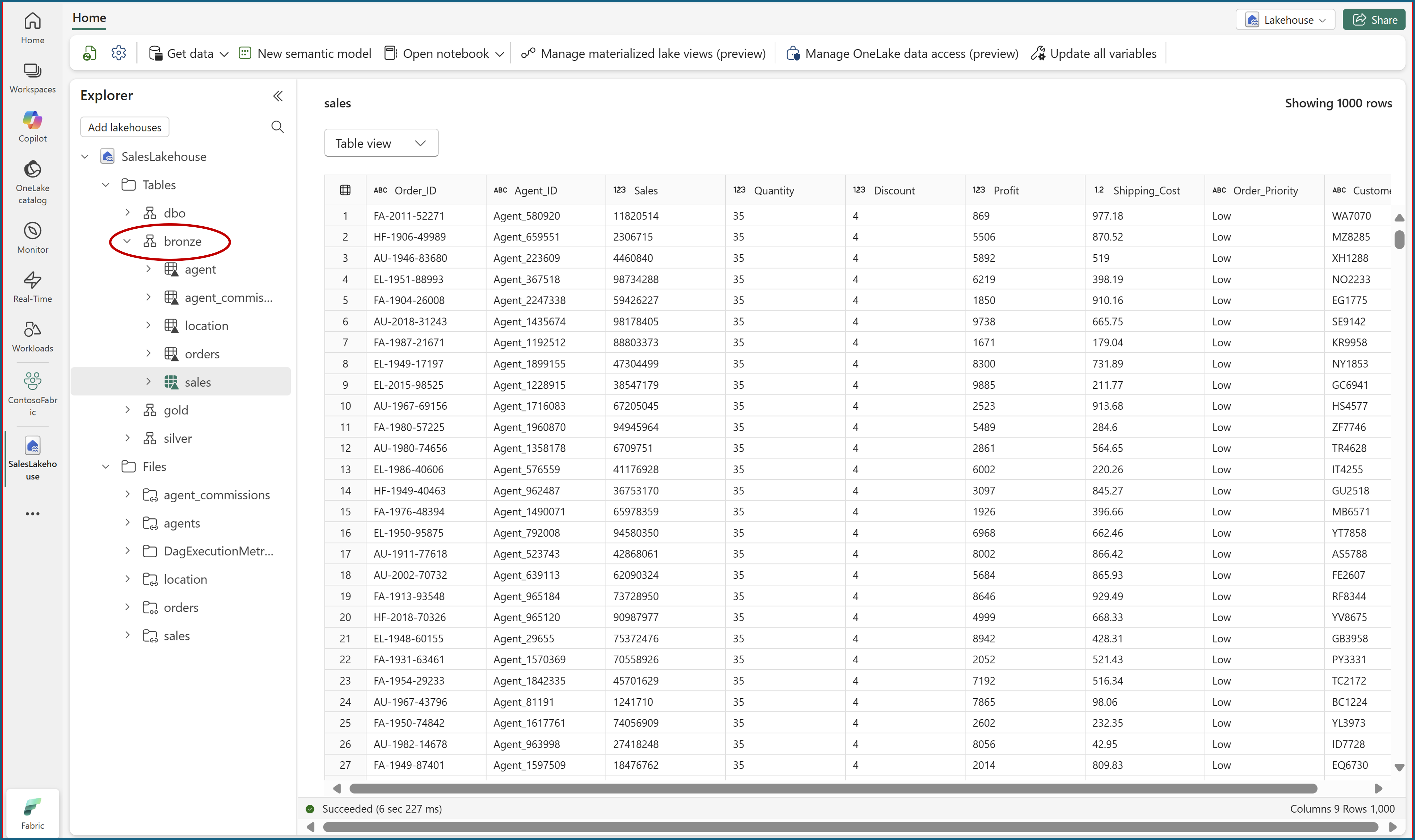 เรียกใช้เซลล์ทั้งหมดของสมุดบันทึกโดยใช้ Spark SQL เพื่อสร้างมุมมองทะเลสาบที่เป็นรูปธรรมด้วยข้อจํากัดด้านคุณภาพของข้อมูล เมื่อเซลล์ทั้งหมดได้รับการดําเนินการเรียบร้อยแล้ว ให้รีเฟรชแหล่งข้อมูล SalesLakehouse เพื่อดูมุมมองทะเลสาบที่เพิ่งสร้างขึ้นใหม่สําหรับ Schema สีเงินและสีทอง